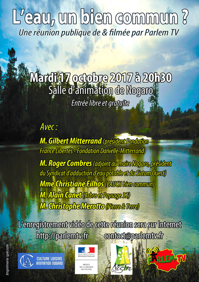 Hier soir (mardi 17 octobre ) à la salle d’animation de Nogaro on a pu assister, participer, filmer une discussion de très haut niveau sur le thème de "l’eau, un bien commun ?". A la fin on se sentait plus intelligent sur le sujet. Comme quoi même en pleine campagne on peut le faire.