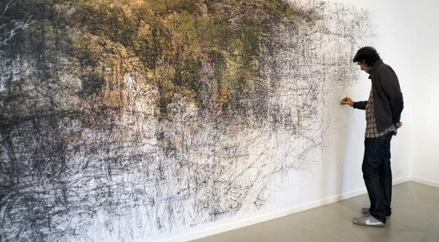 Galerie Bleue au collège Val d’Adour de Riscle : Samedi 30 mai à 17h, Bertrand Flachot continuera le dessin entrepris sur la grande photo panoramique installée au premier étage et à partir de 18h il discutera avec le public au CDI.