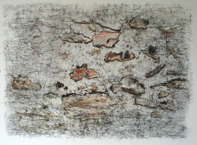 Il y a d’abord la photo, essentiellement du paysage avec laquelle Bertrand Flachot entretient une relation intime : les abords de sa maison ; le fouillis d’un pré dégagé des hautes herbes ; les ronciers ; un sous-bois rendu à la nature ou un vieil arbre fruitier arraché de ses mains ; ou encore un nid d’oiseau tombé dans la haie. C’est au départ une photo techniquement irréprochable avec ses valeurs de gris ou ses couleurs subtiles qui devient le support du dessin. Un tracé très fin, nerveux et compulsif prolonge branches et brindilles, suit le mouvement des lianes et des herbes dans un fouillis inextricable comme si le geste pulsionnel de la main démultipliait la nature saisie dans l’instant. Comme si l’instant bref de photographique était prolongé et continué à l’infini. La photo en tant qu’image peut disparaître, il en subsiste sa trace indélébile, sa présence muette, une sorte d’aura qui cristallise l’objet disparu. Une série sur les nids qui présente les trois moments de la création est parfaitement évocatrice de cette réalité « augmentée ». L’image a son autonomie, le dessin possède la sienne et la superposition des deux révèle un monde inédit ou le réel et le virtuel se mêlent dans une dimension onirique.