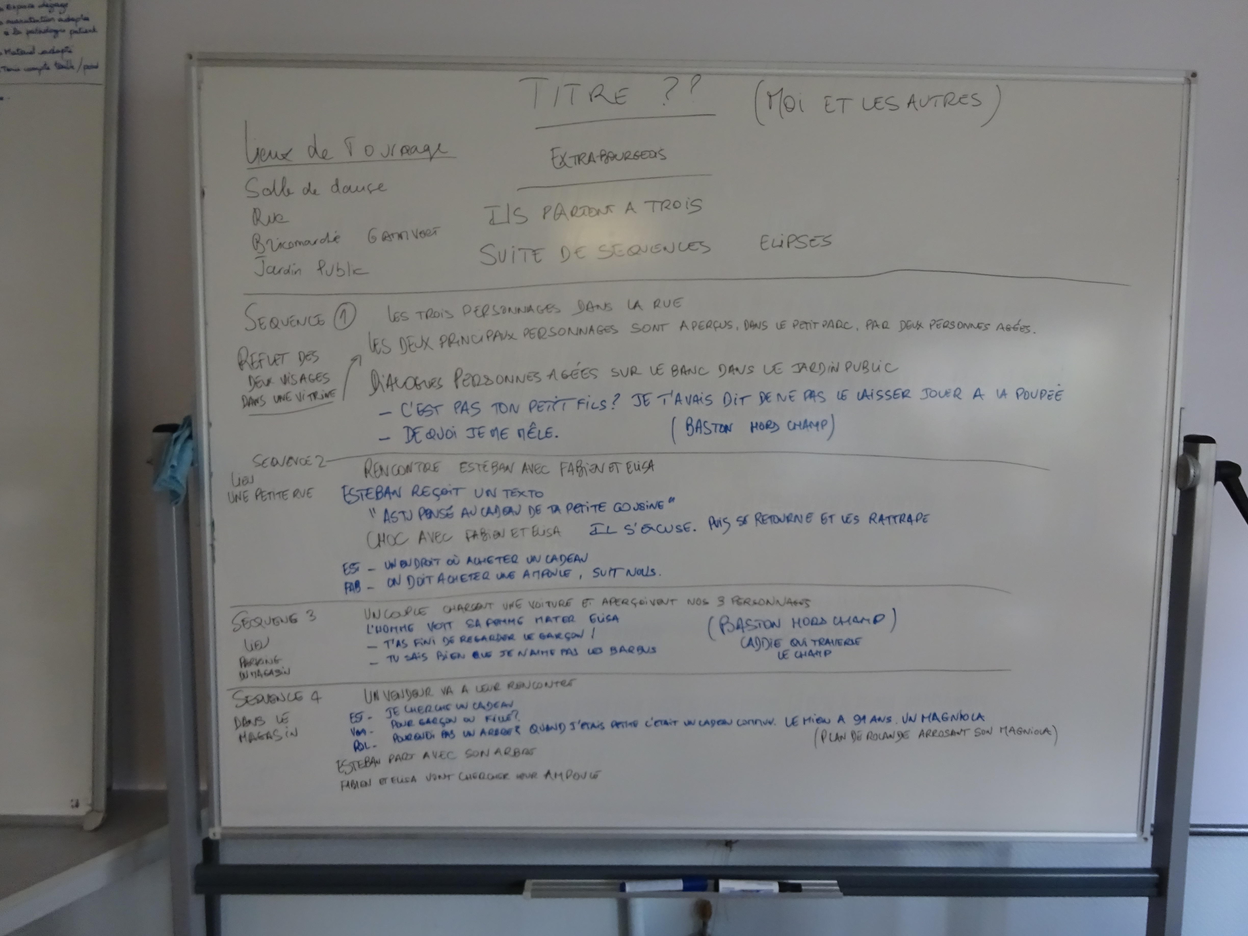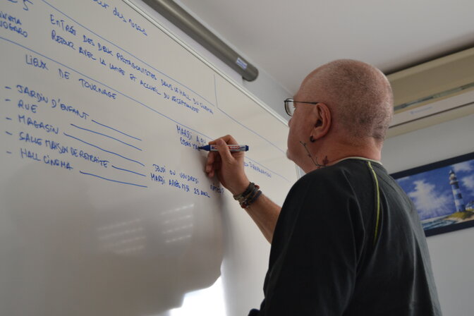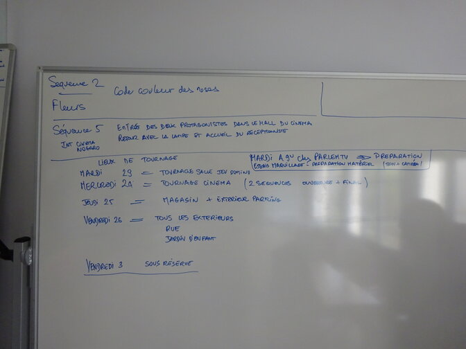 Une vingtaine de personnes pour participer à la finalisation du scénario en liant chaque séquence à des endroits bien précis, découpages, répartition des rôles et des taches techniques... Liste des objets, des habits...